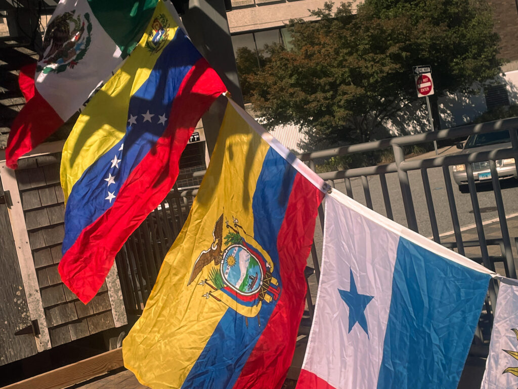 Among the first to arrive were members of the Las Voces Unidas Club, an affinity organization from Connecticut College committed to fostering belonging and visibility for Latine students and allies on campus. They awakened early to board two Camel Vans, transportation provided by the Holleran Center for Community Action, and by 10 a.m. they were already hard at work carrying tables, lifting tents, and hanging flags. With smiles and determination, students helped community members unload cars packed with the tools of celebration. As they started hanging streamers, unpacking cultural displays, raising the scarlet, green, yellow, and blue flags of Latin America, the plaza slowly became a canvas of Hispanic heritage.